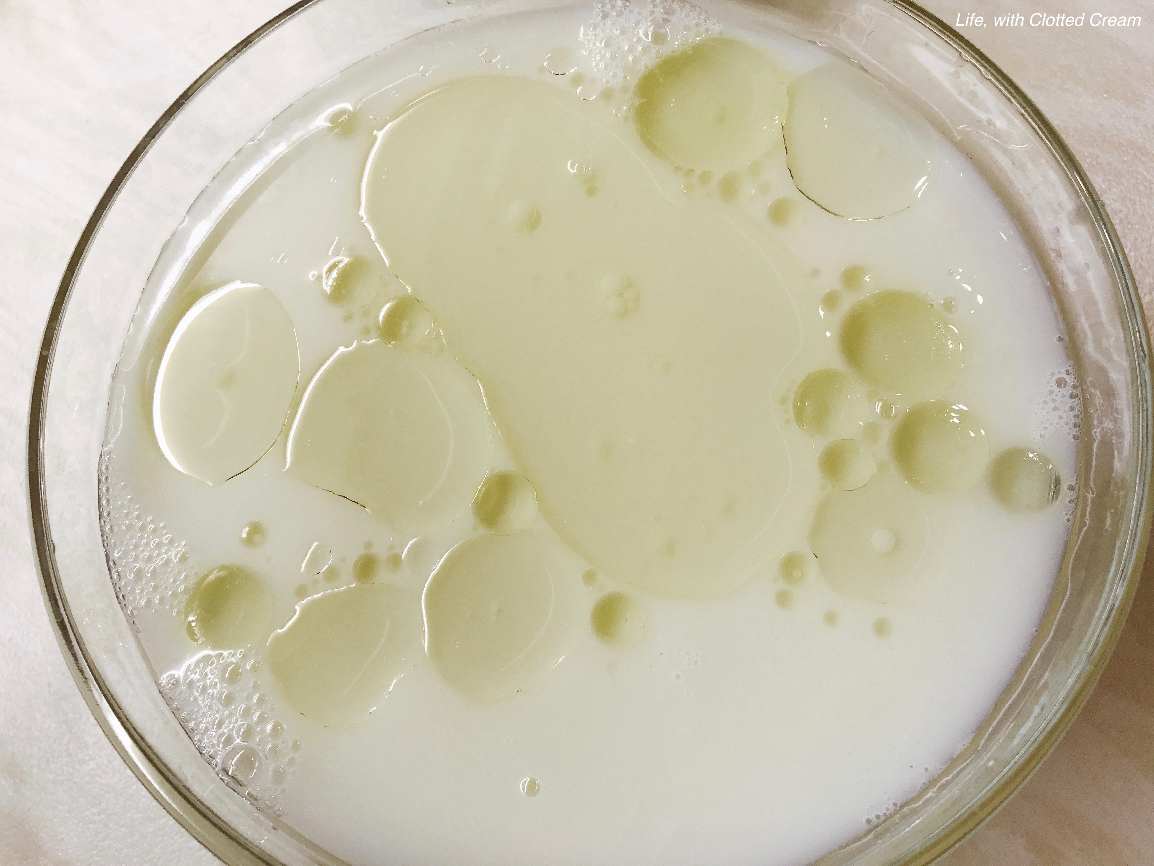 Milk, oil, brandy and water
