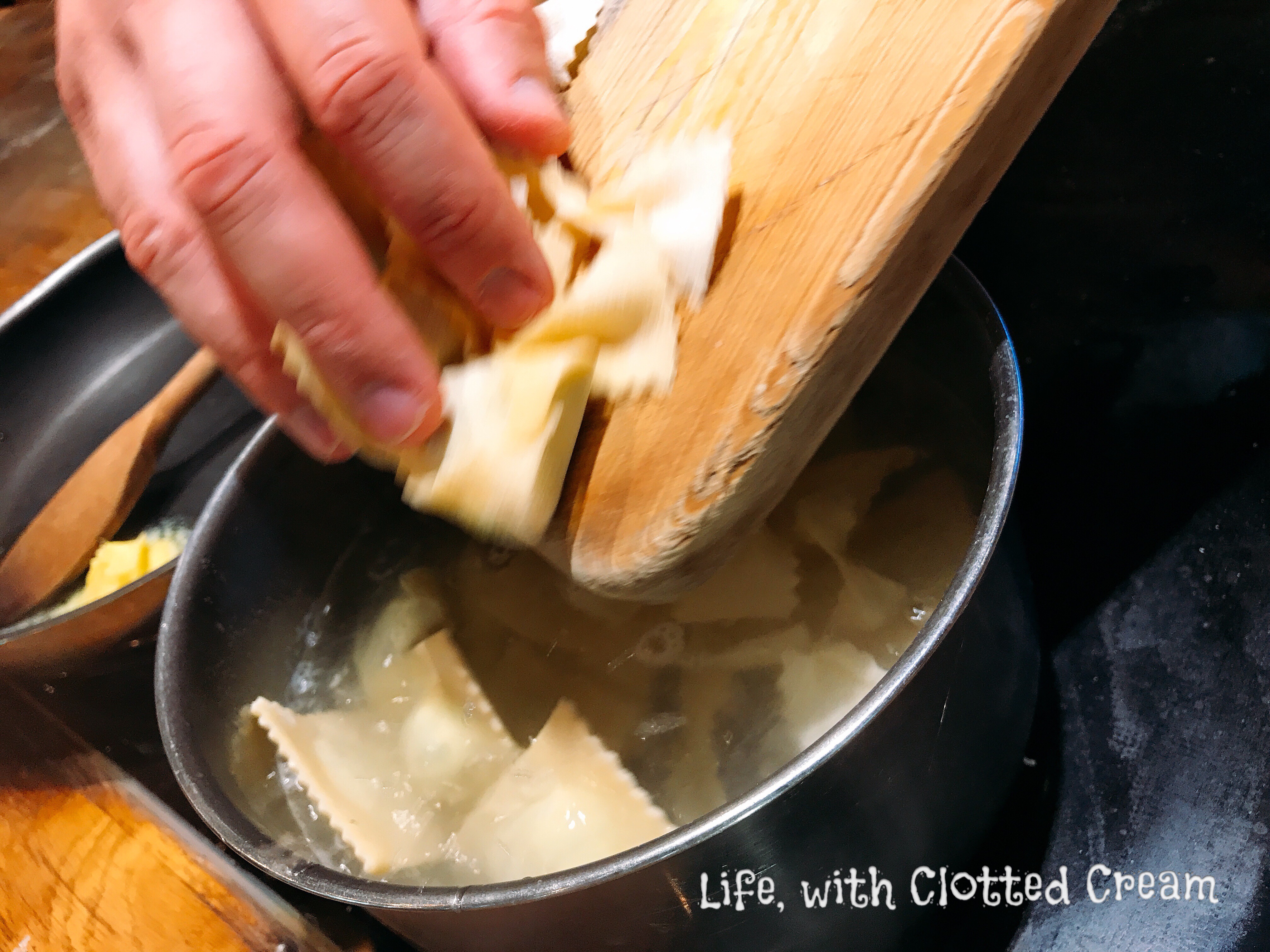 Filled pasta going into the pot. The hubby cooking the pasta in boiling salted water.