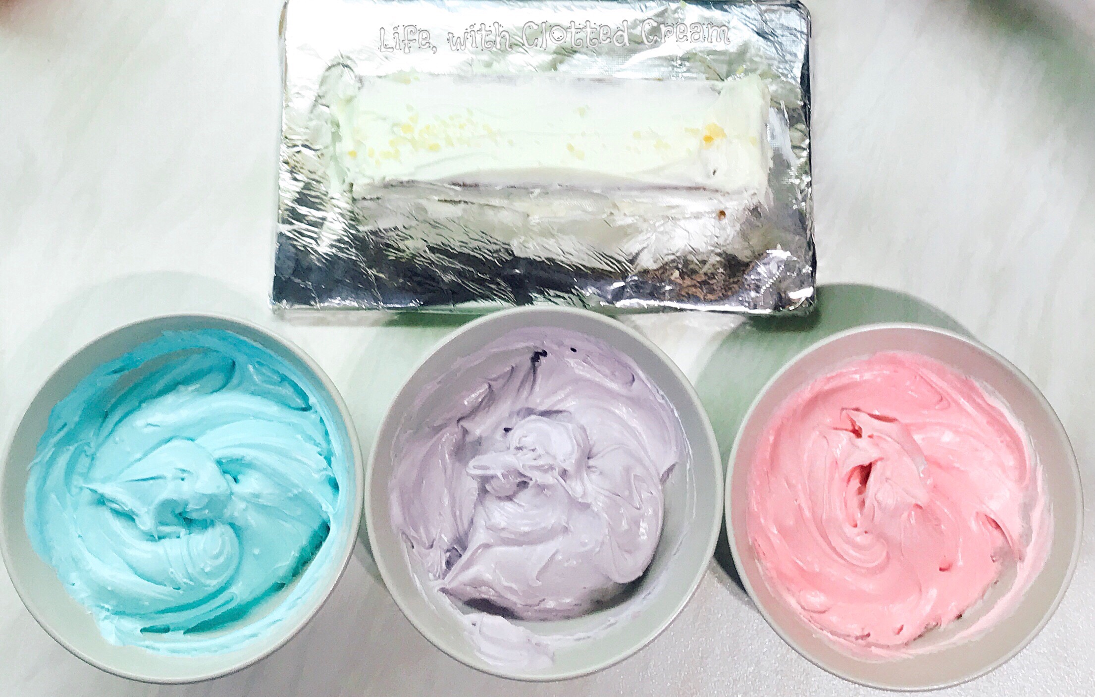 Blue Purple Pink icing in three bowls with iced cake and popping candy