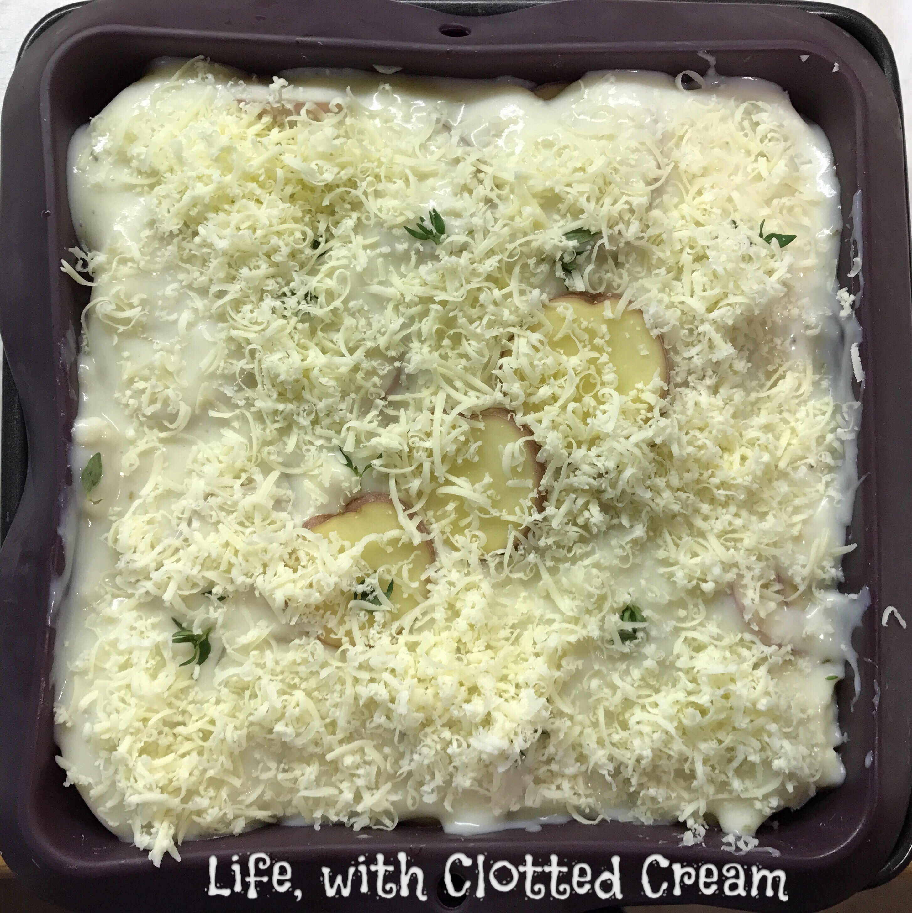 Scatter some cheese over the top and place in the oven. Bake for 30 minutes or until the potatoes are cooked through.